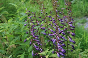 濃紫色の蕾の状態のまま開かない変わった花を咲かせます。