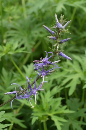 山地に自生し、青紫色の花冠が深く裂けた独特の形の花を咲かせます。